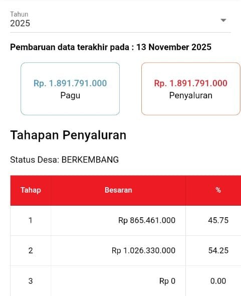 Rincian Dana Desa: *Pagu: Rp 1.891.791.000. – Tahap I: Rp 865.461.000. Tahap II: Rp 1.026.330.00. – Tahap III: Nihil. Status Desa: Berkembang